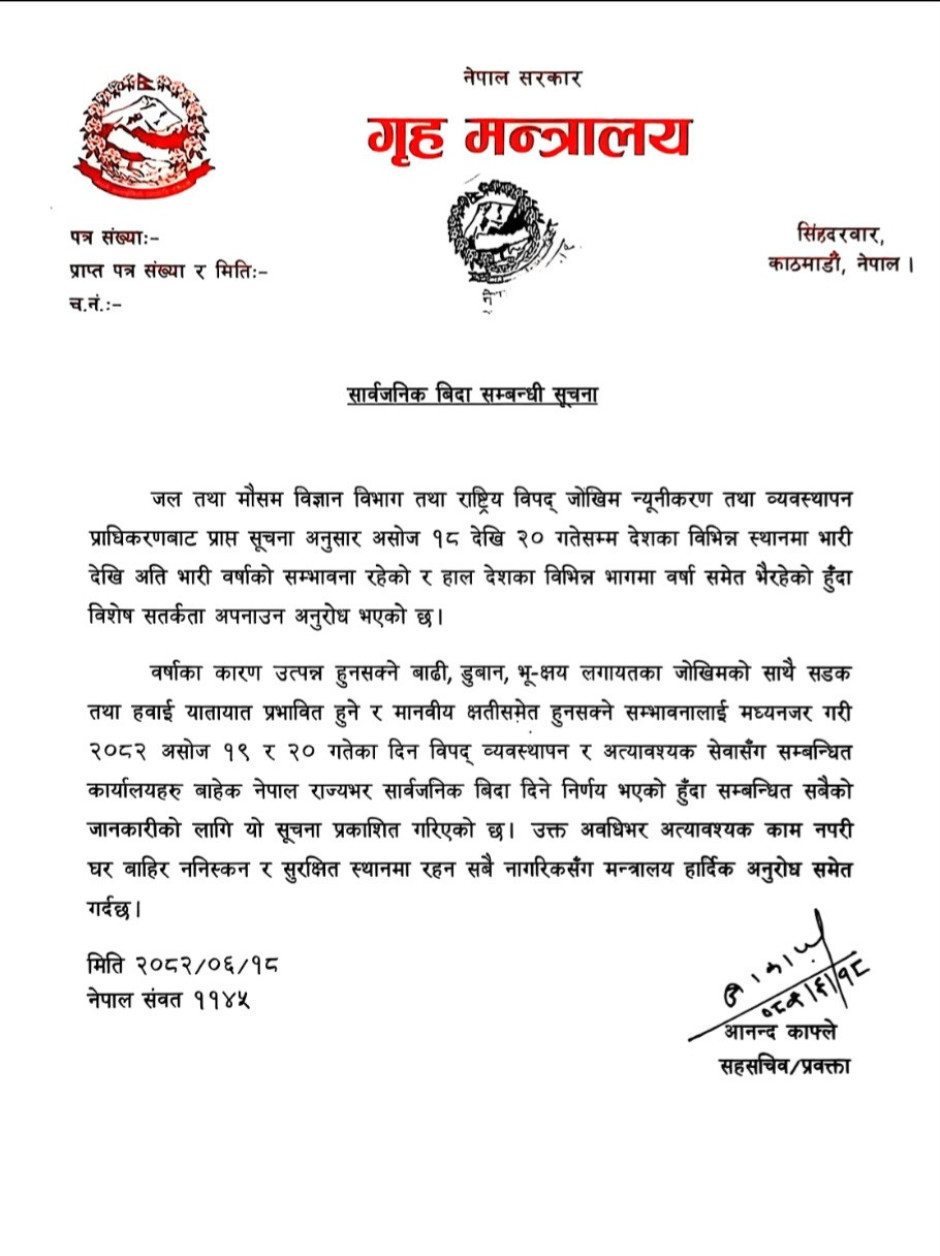 सार्वजनिक विदाको दिनमा सेवा प्रवाह हुने सम्बन्धी सूचना ।