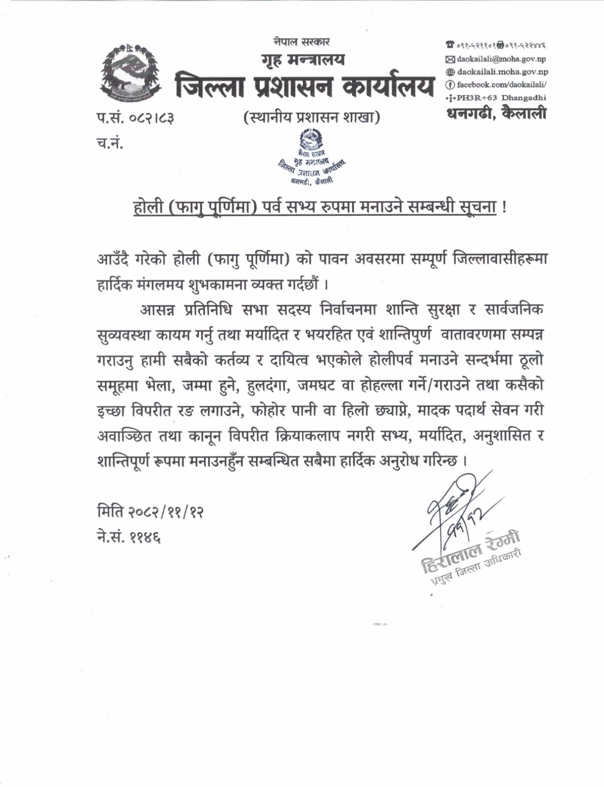 होली (फागु पूर्णिमा) पर्व सभ्य रुपमा मनाउने सम्बन्धी सूचना !