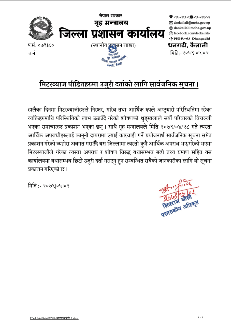 तस्बिर : मिति २०७९।०५.०५ गतेसम्म मिटरब्याज पीडितहरुमा उजुरी दर्ताको लागि सार्वजनिक सूचना