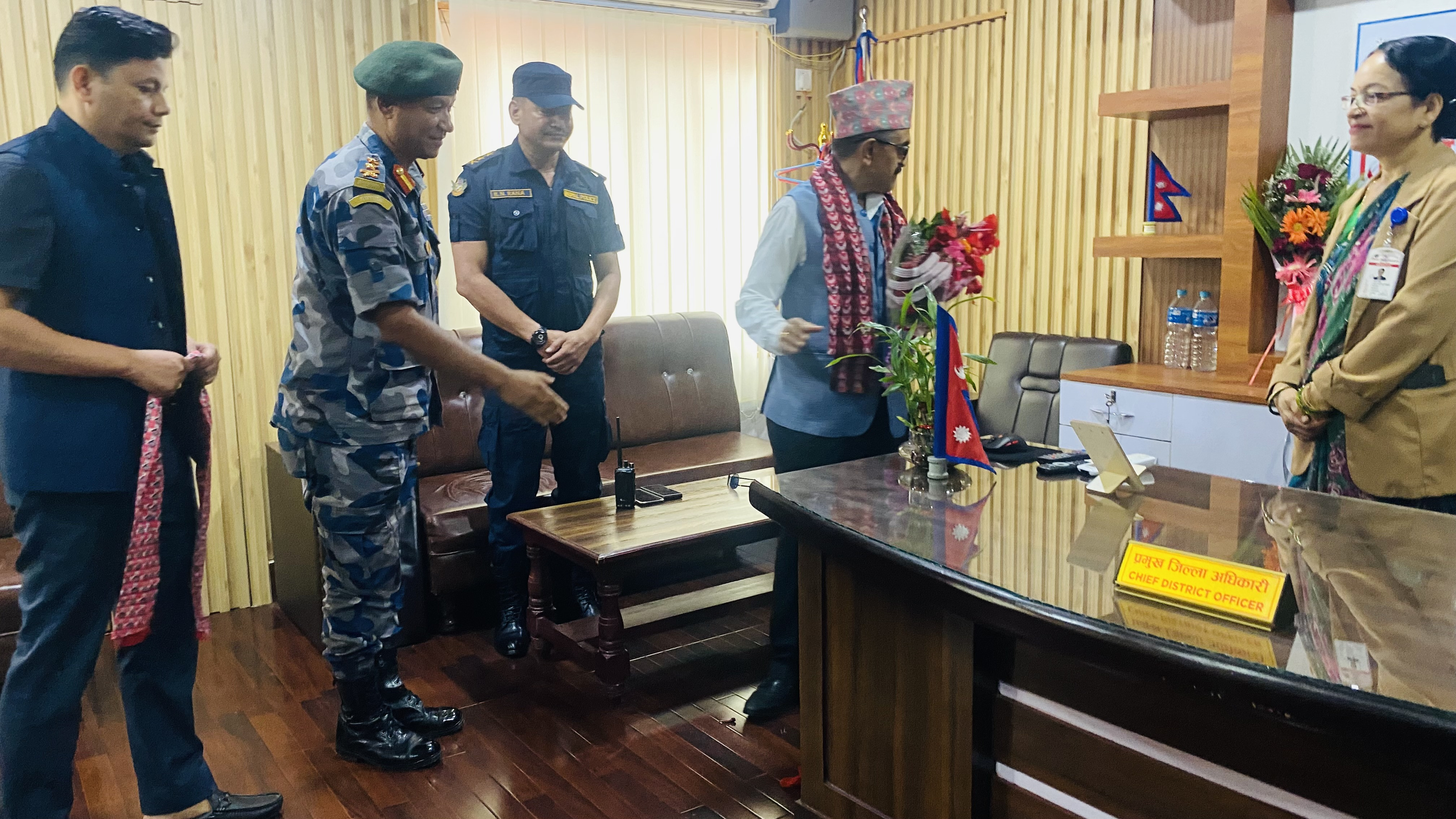 माननीय गृहमन्त्रीज्यूलाई जिल्लाको शान्ति सुरक्षाको अवस्था अवगत गराउदै