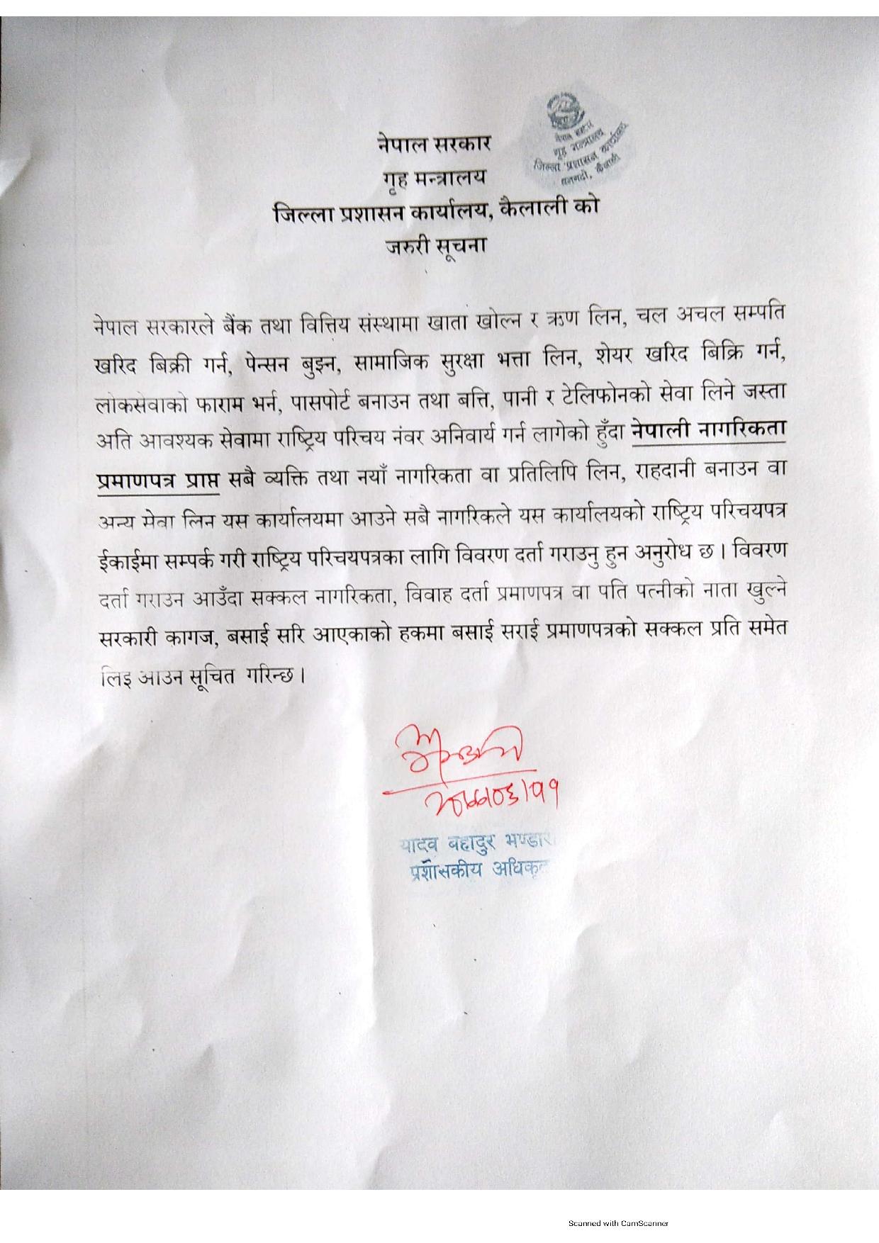 राष्ट्रिय परिचयपत्र सम्बन्धि जरुरी सूचना
