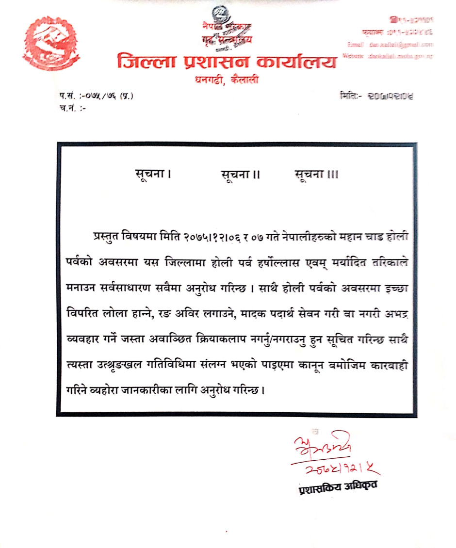 २०७५ सालको होली पर्व मर्यादित रुपमा मनाउने सम्बन्धी जिल्ला प्रशासन कार्यालयको सूचना