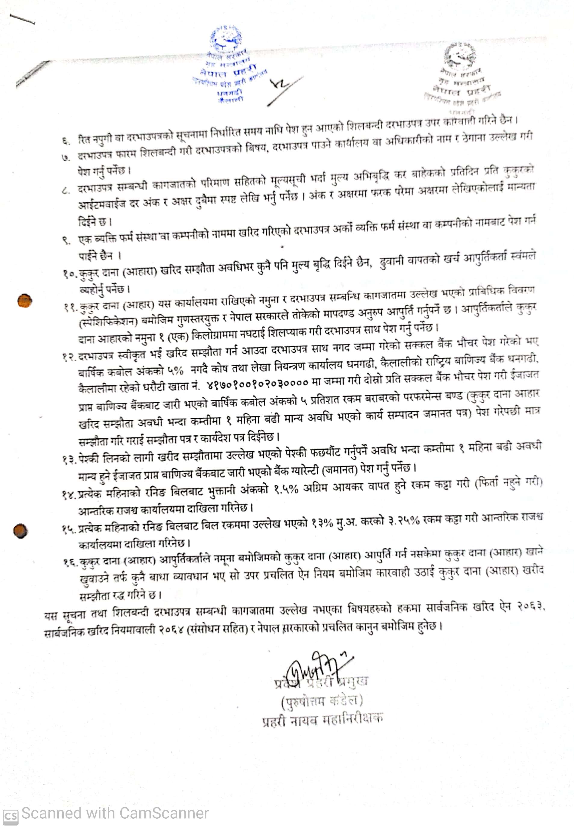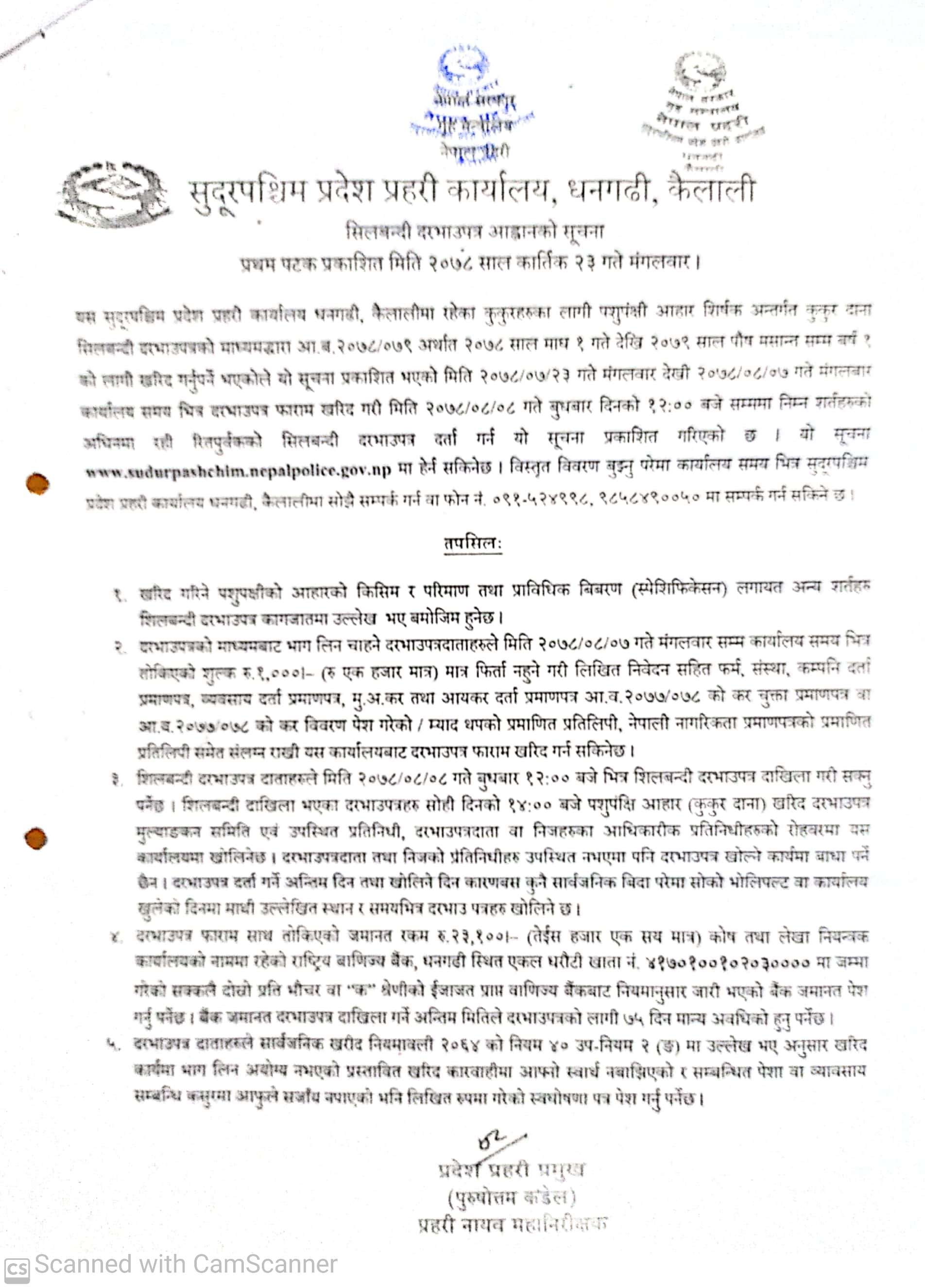 सुदूरपश्चिम प्रदेश प्रहरी कार्यालय धनगढीको शीलबन्दी दरभाउपत्रको सूचना ।