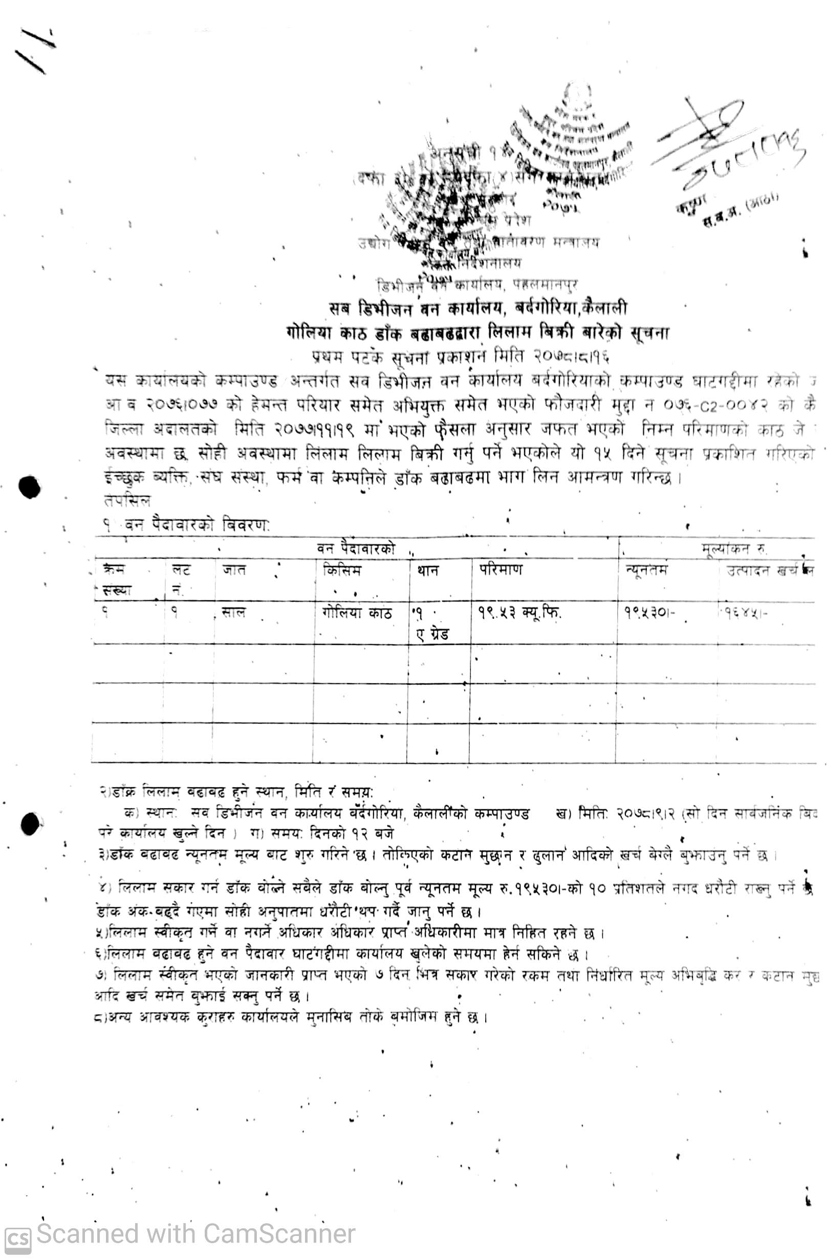 सब डिभिजन वन कार्यालय बर्दगोरिया कैलालीको काठ लिलामको सूचना ।