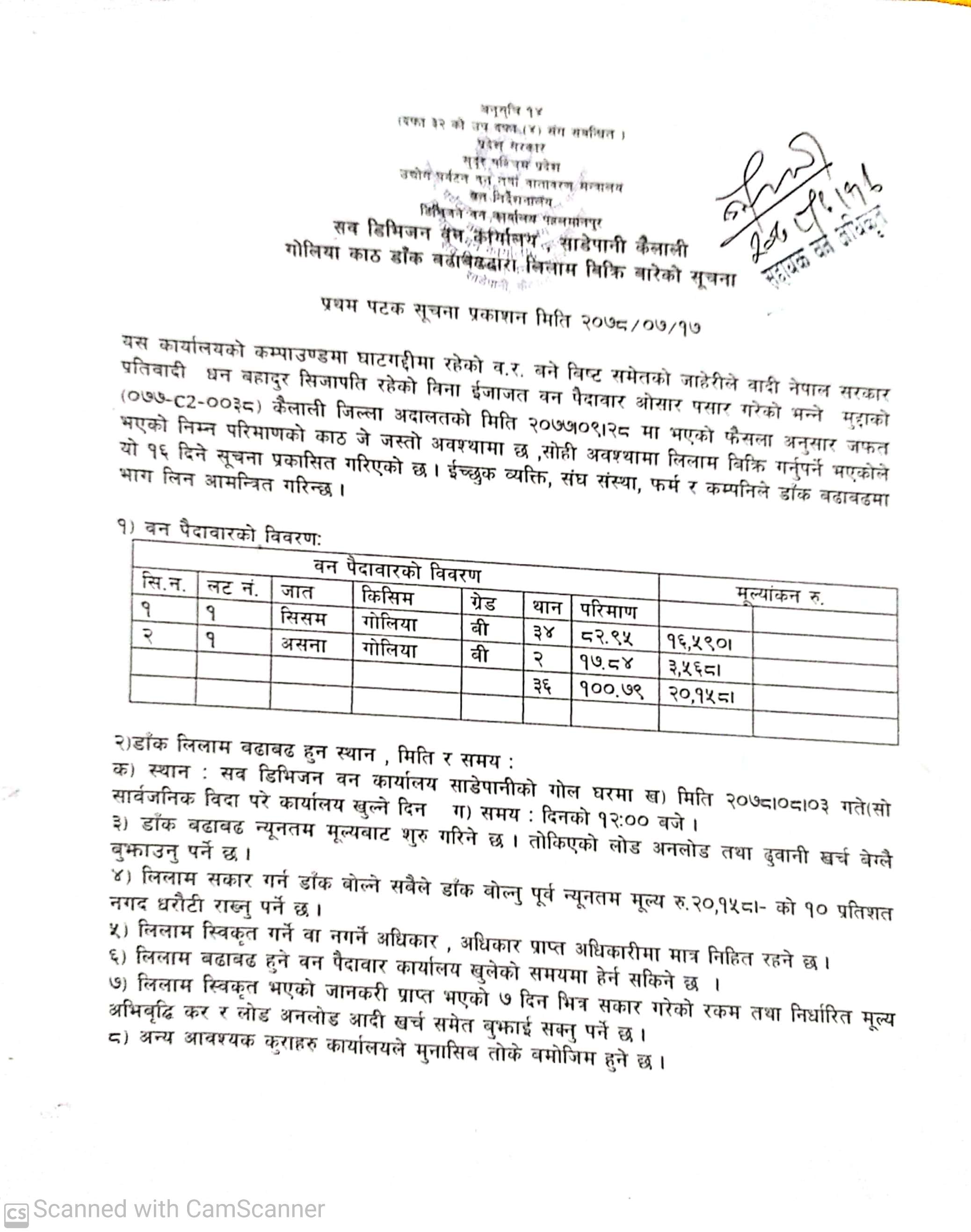 डिभिजन वन कार्यालय धनगढीको सूचना ।
