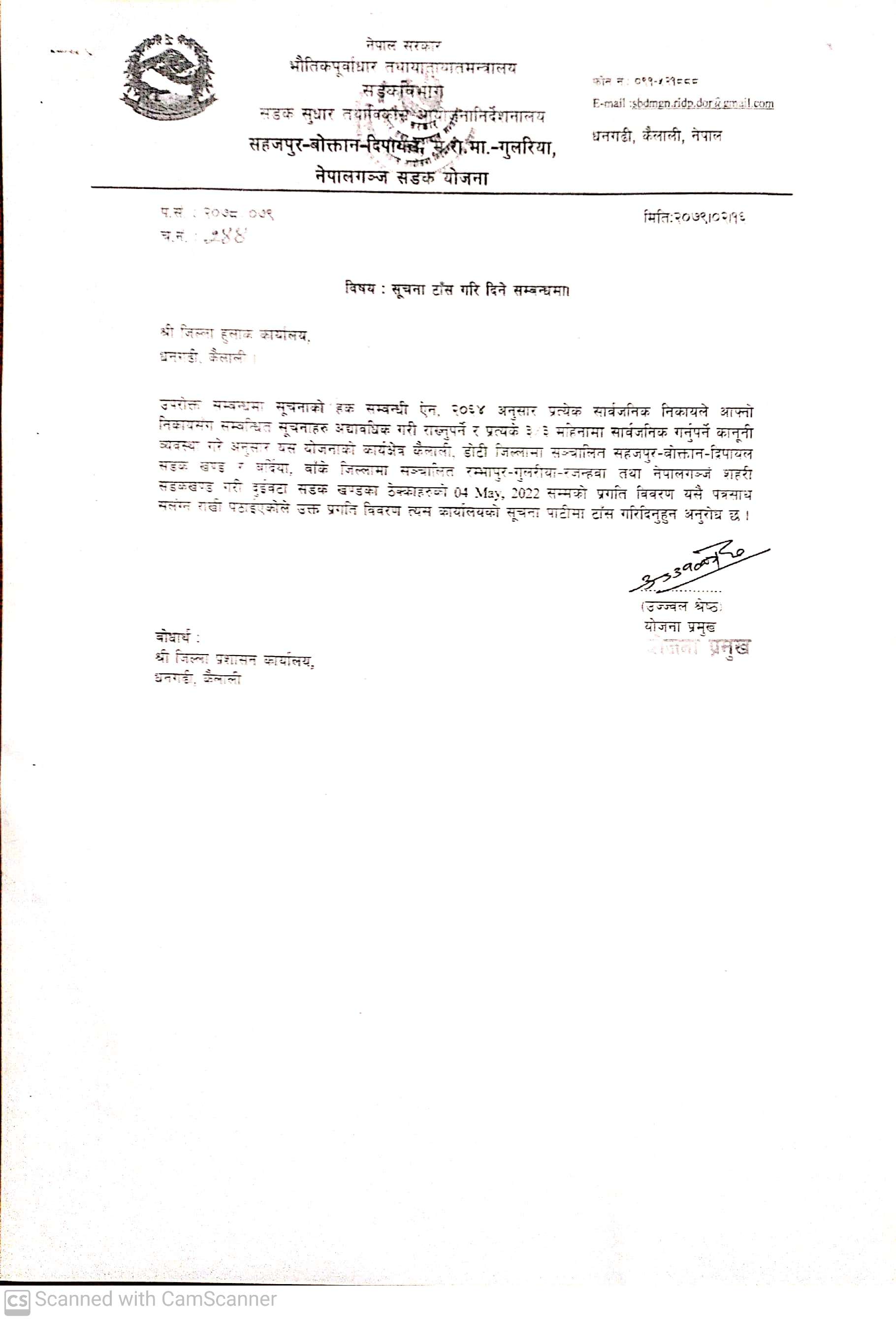 सहजपुर बोगटान दिपायल सडक योजनाको सूचना ।