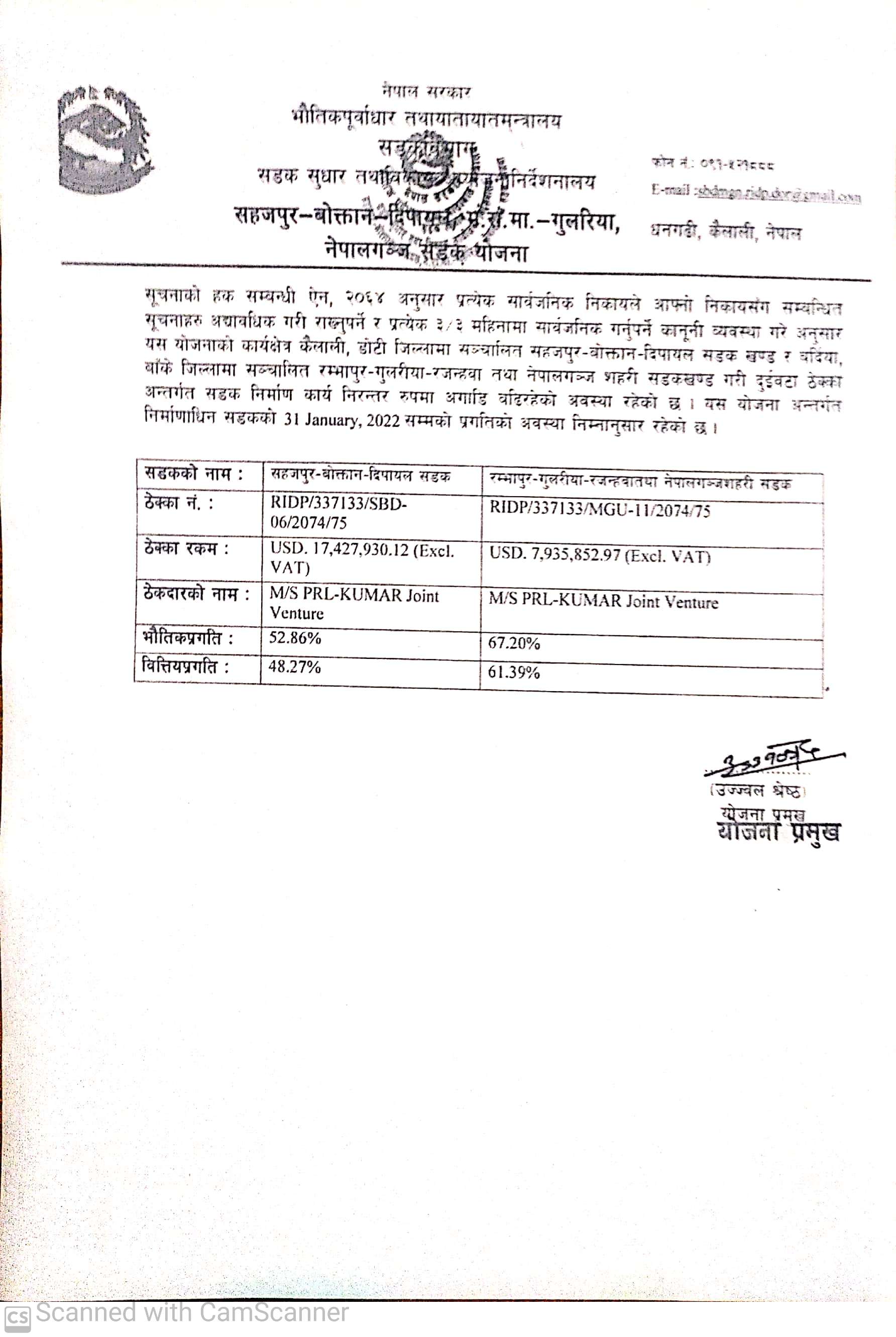सहजपुर बोक्तान दिपायल म.रा.म.-गुलरिया नेपालगञ्ज सडक योजनाको प्रगति बिवरण ।