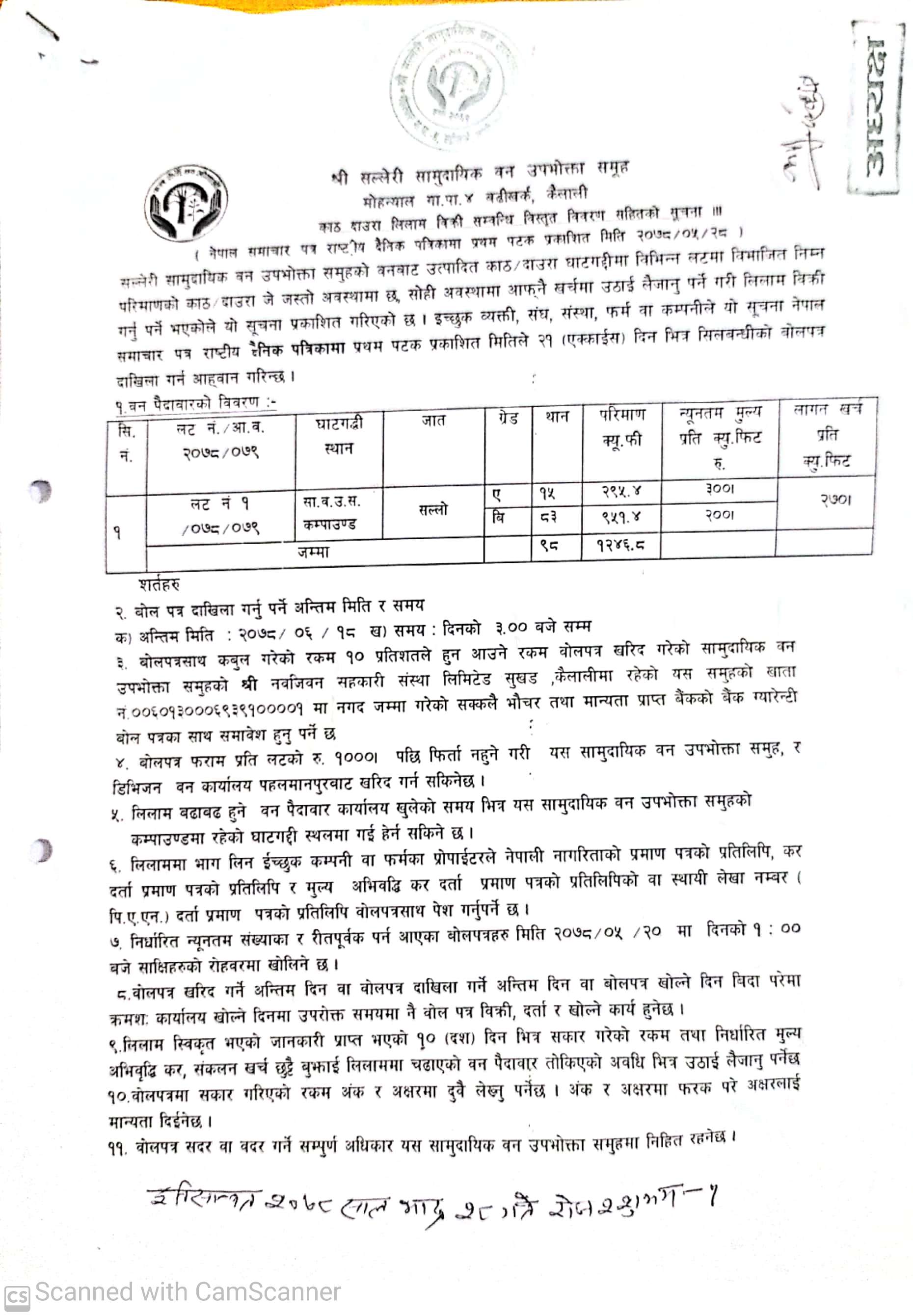सल्लेरी सामुदायिक वन उपभोक्ता समूह, मोहन्याल कैलालीको सूचना ।