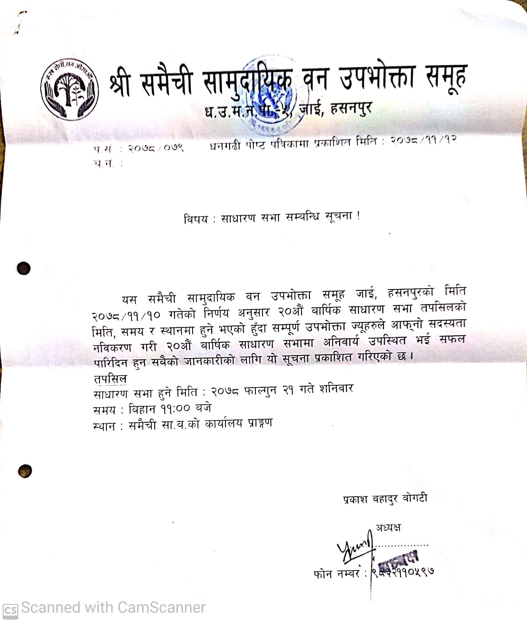 समैची सामुदायिक वन उपभोक्ता समूह जाइ धनगढीको साधारण सभा सम्बन्धी सूचना ।