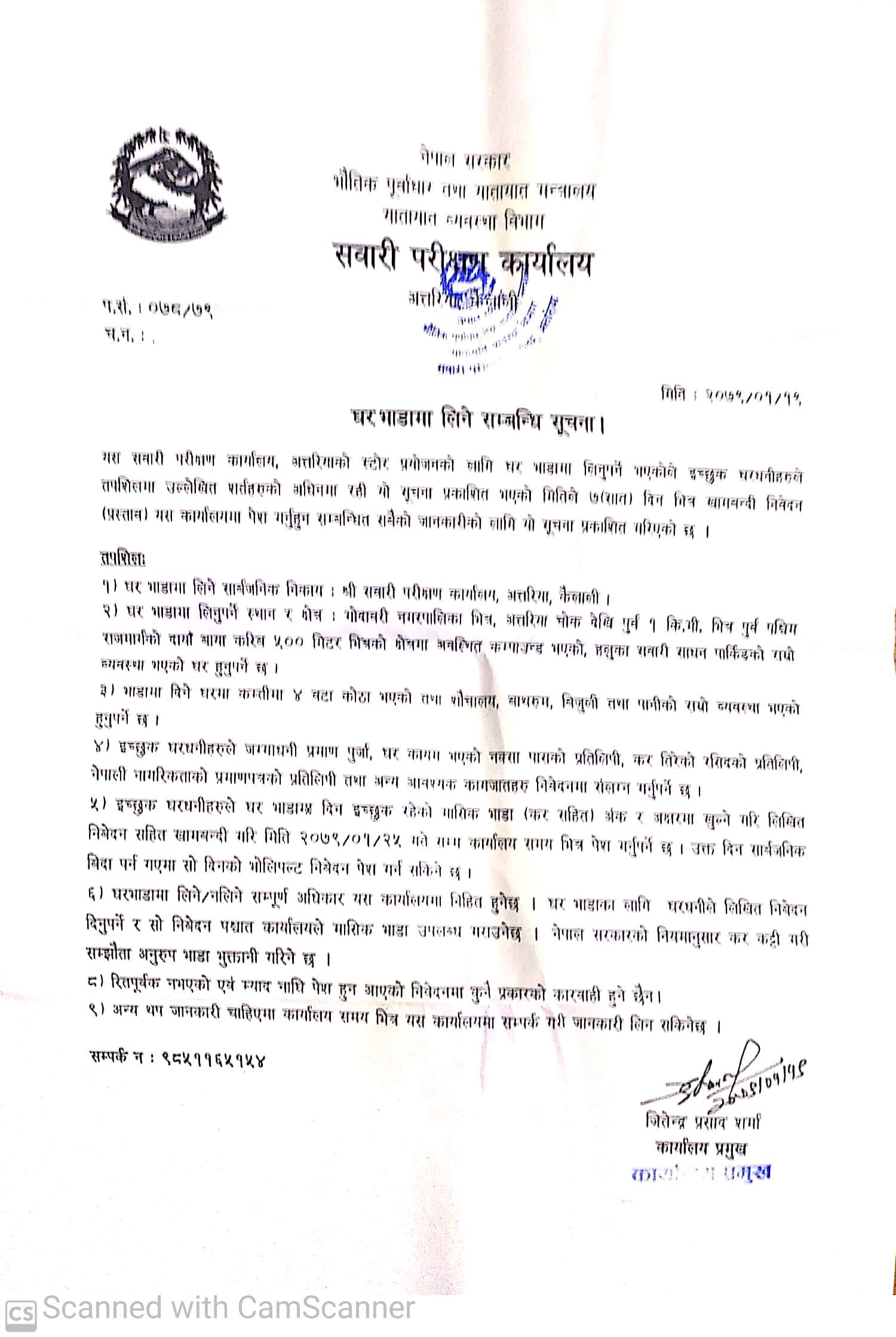 सवारी परीक्षण कार्यालय अत्तरिया कैलालीको घरभाडाको सूचना ।