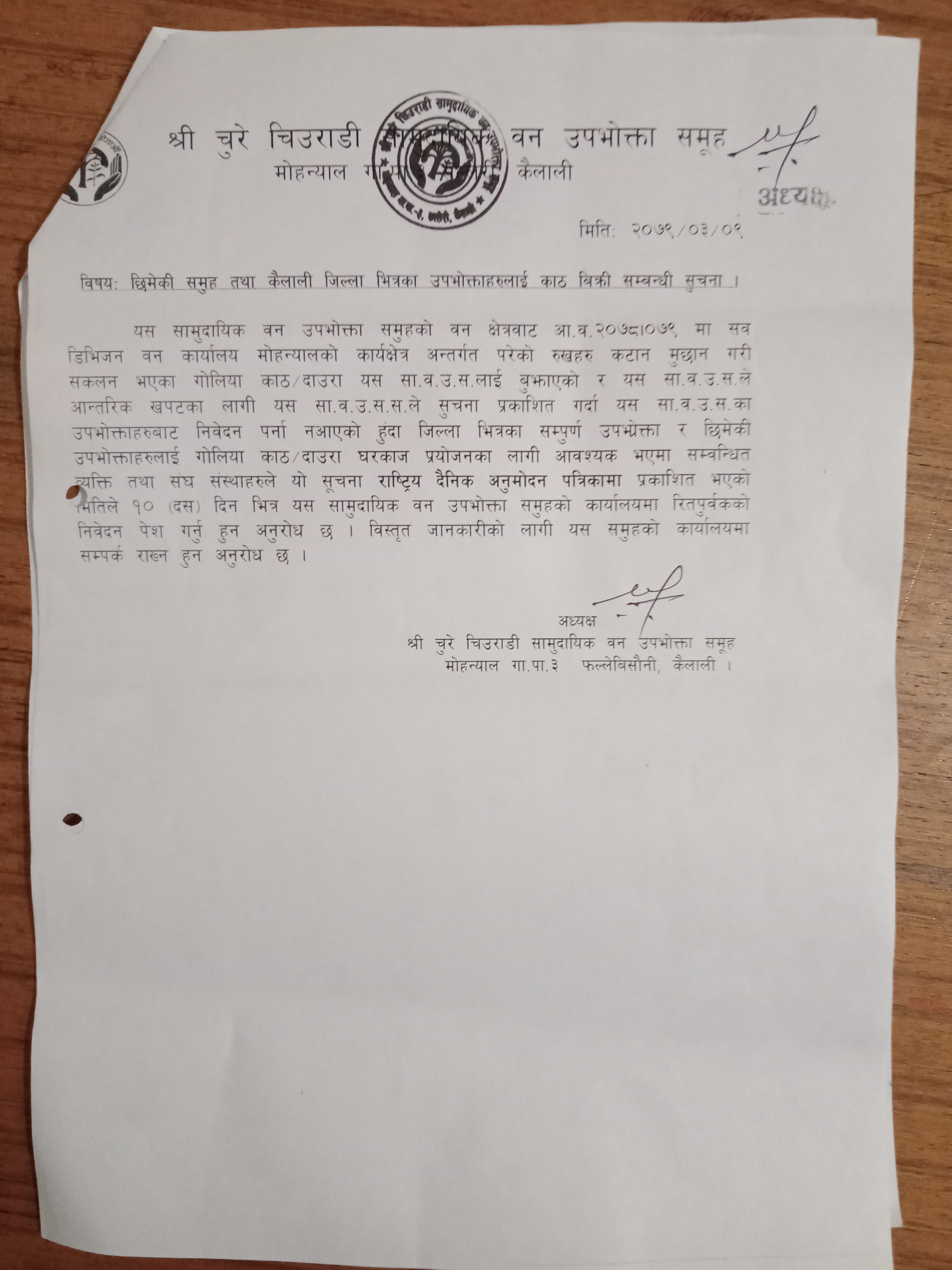 श्री चुरे चिउराडी सामुदायिक वन उपभोक्ता समूह मोहन्याल कैलालीको सूचना ।