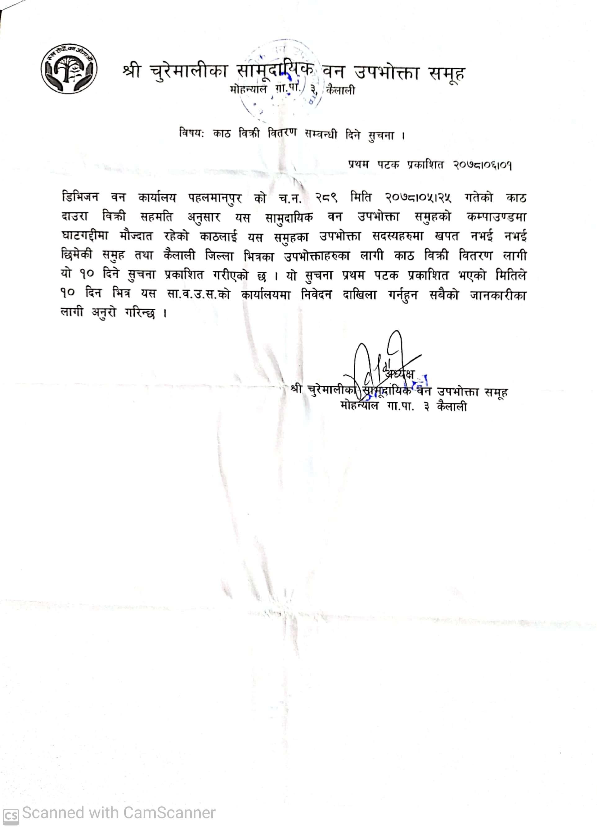 श्री चुरेमालिका सामुदायिक वन उपभोक्ता समूह, मोहन्याल , कैलालीको सूचना ।