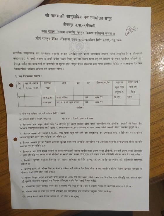श्री जनशक्ति सामुदायिक वन उपभोक्ता समूह टीकापुर २ कैलालीको सूचना ।