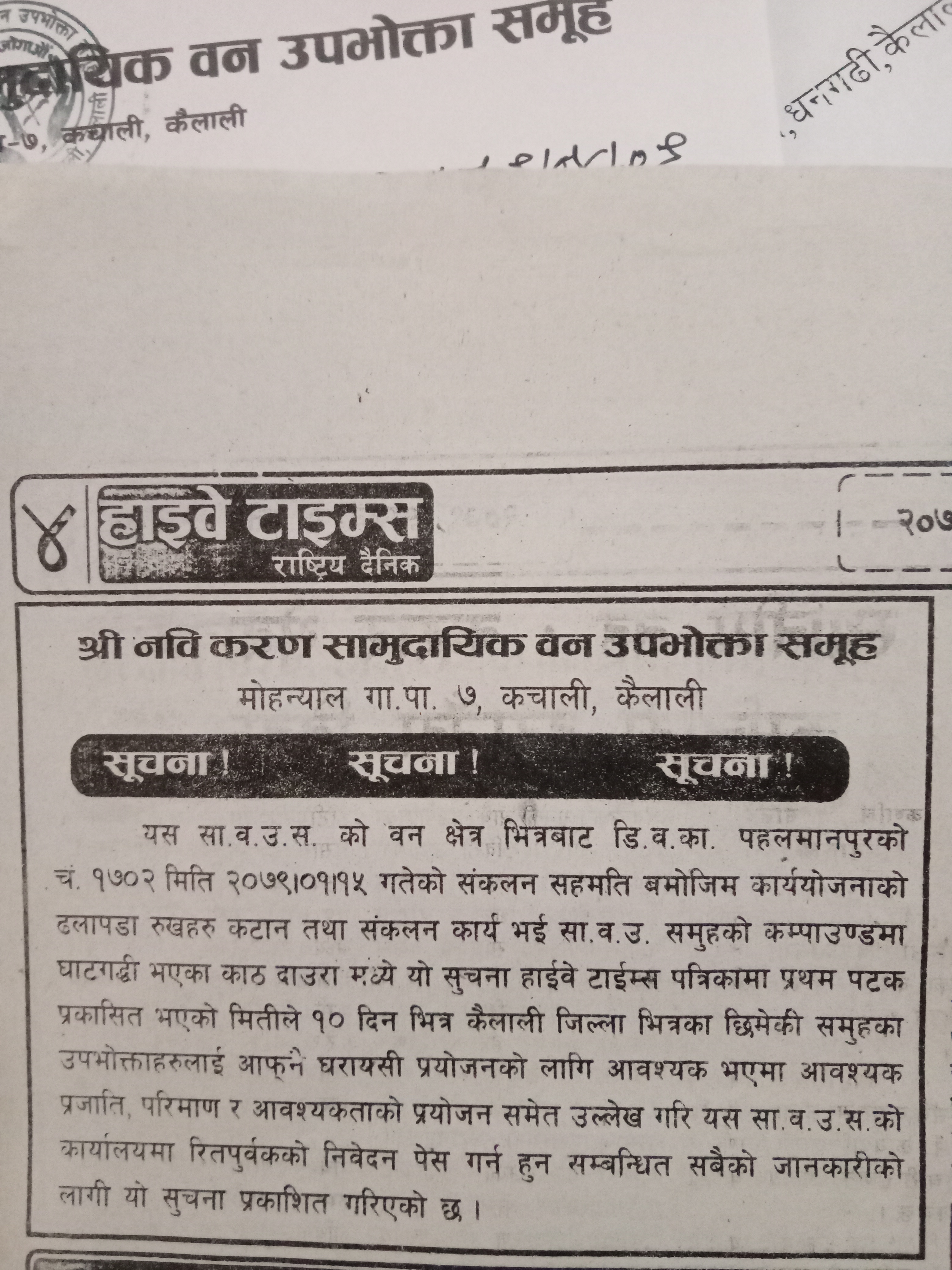श्री नवि करण सामुदायिक वन उ.स. मोहन्याल कैलालीको सूचना ।