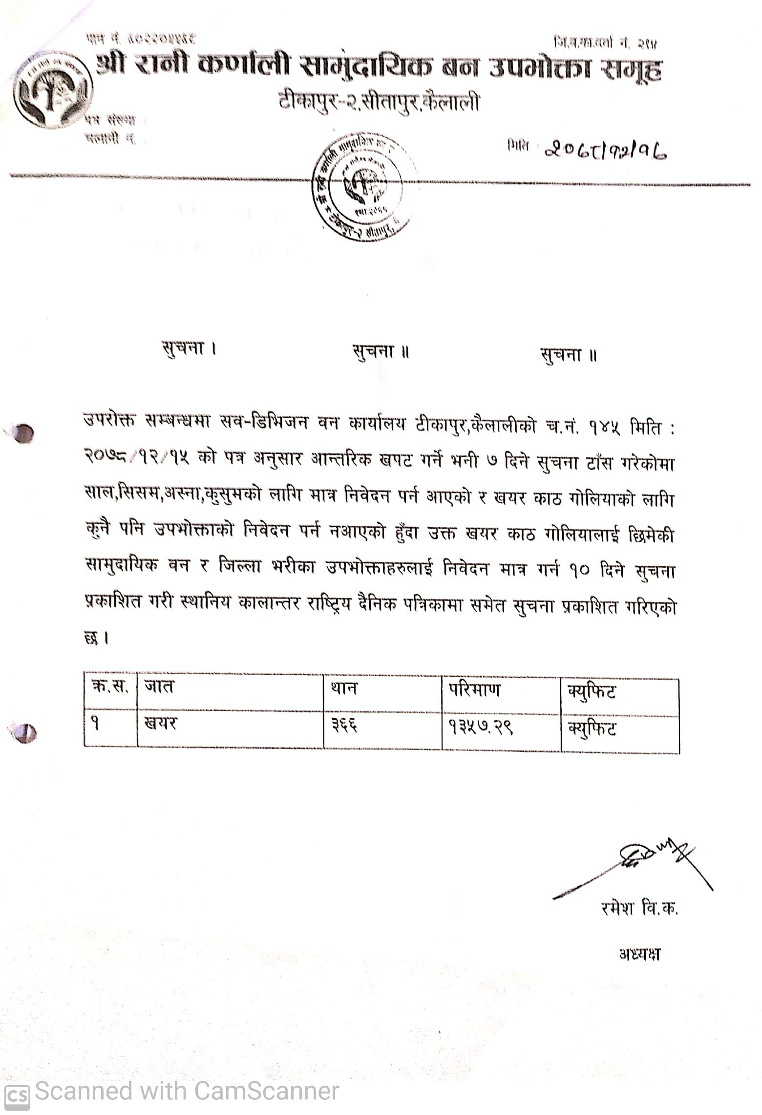 श्री रानी कर्णाली सामुदायिक वन उपभोक्ता समूह टीकापुर २ कैलालीको सूचना ।