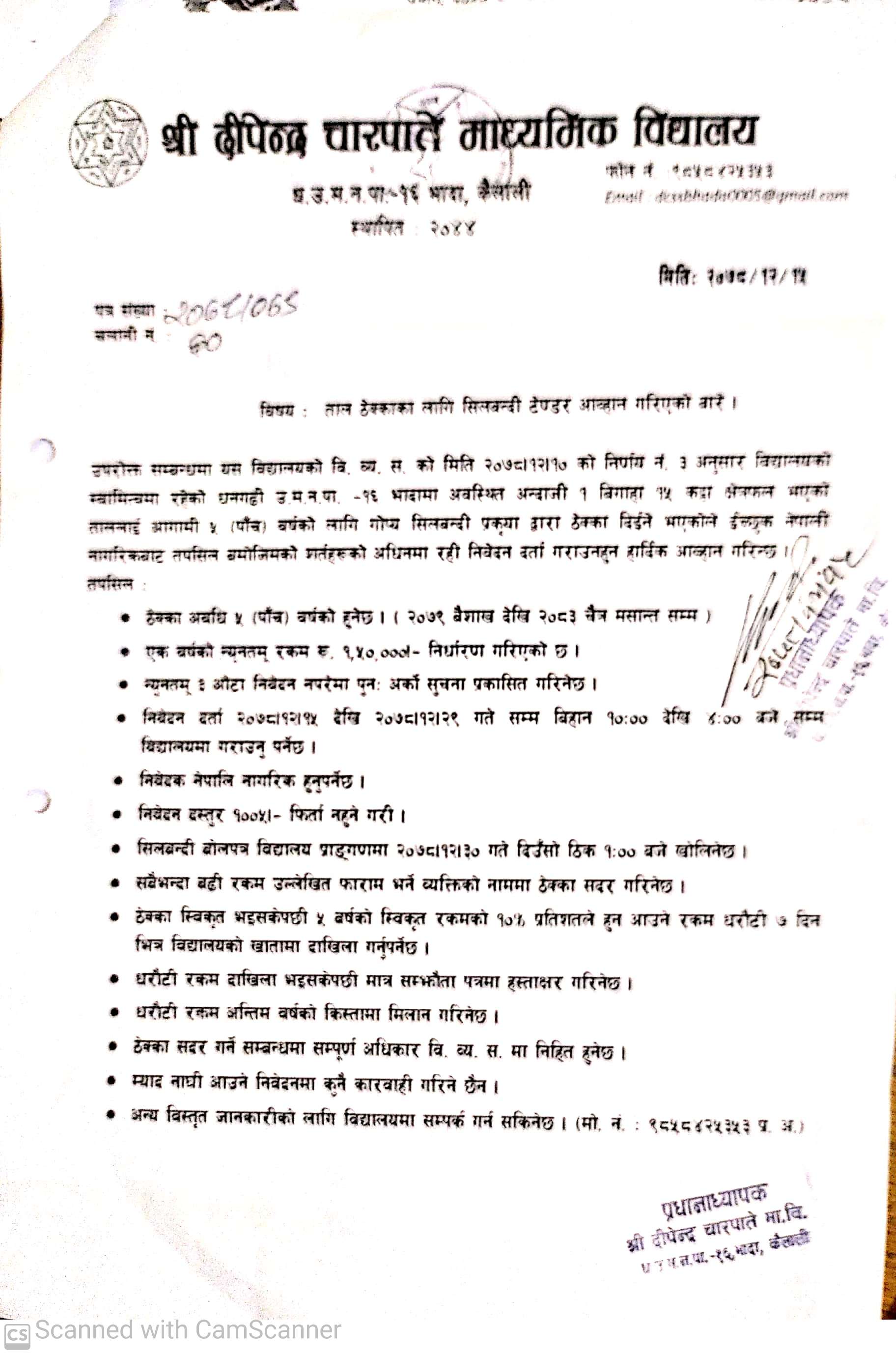 श्री दिपेन्द्र चारपाते मा.बि. भादा कैलालीको टेण्डर आह्वानको सूचना ।