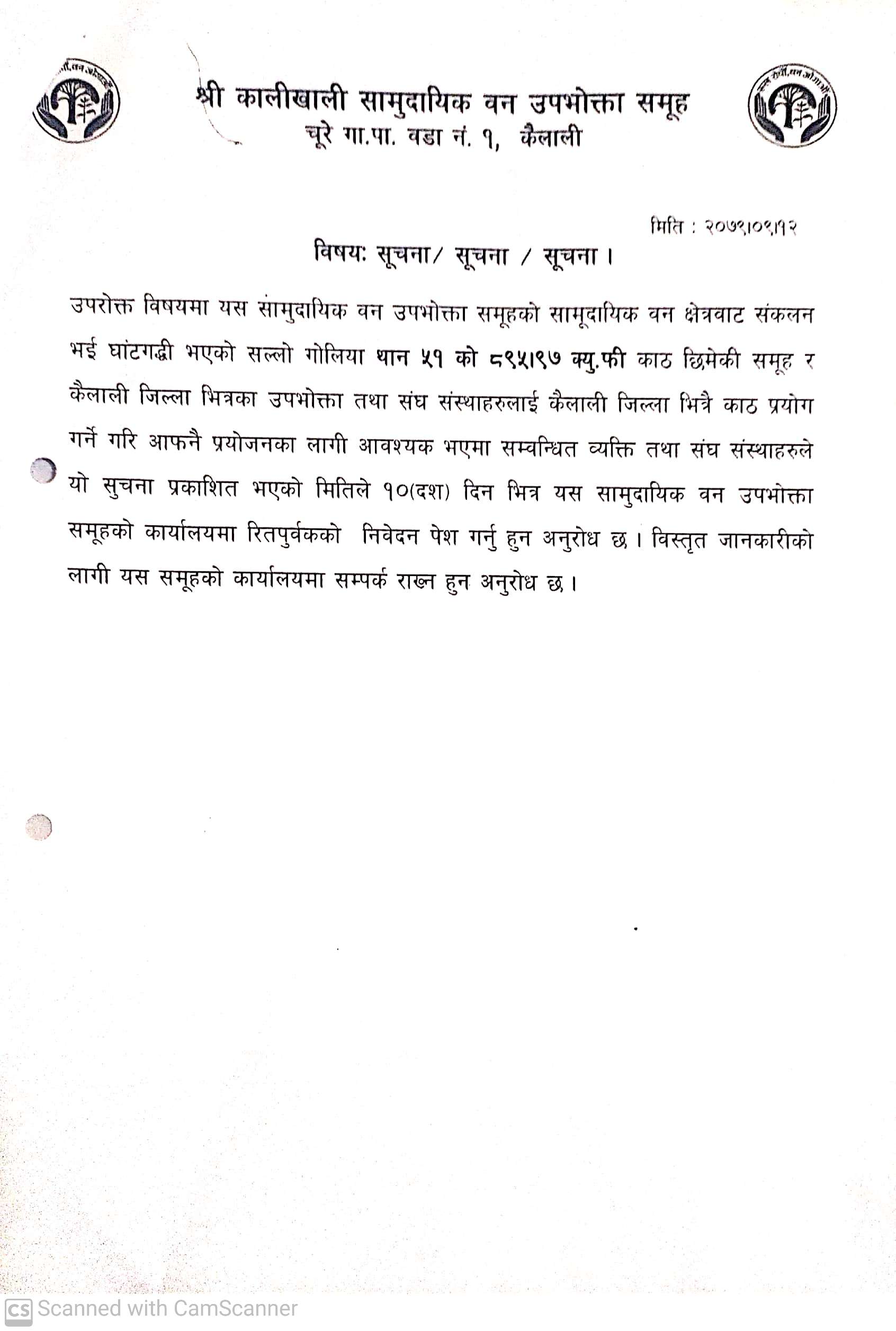 डिभिजन वन कार्यालय धनगढीको सूचना ।