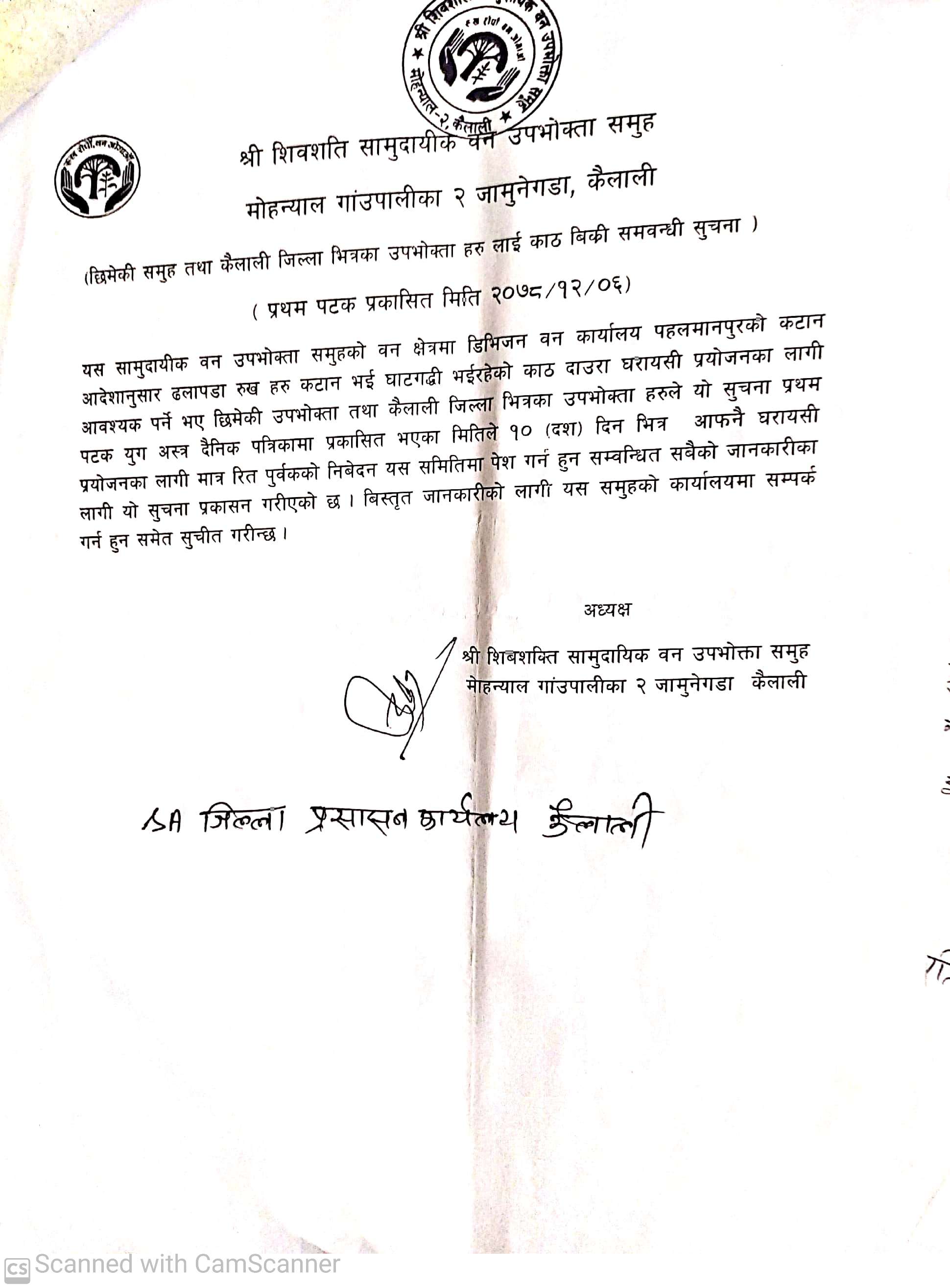 शिवशक्ती सामुदायक वन उपभोक्ता समूह, मोहन्याल कैलालीको काठ बिक्रीको सूचना ।
