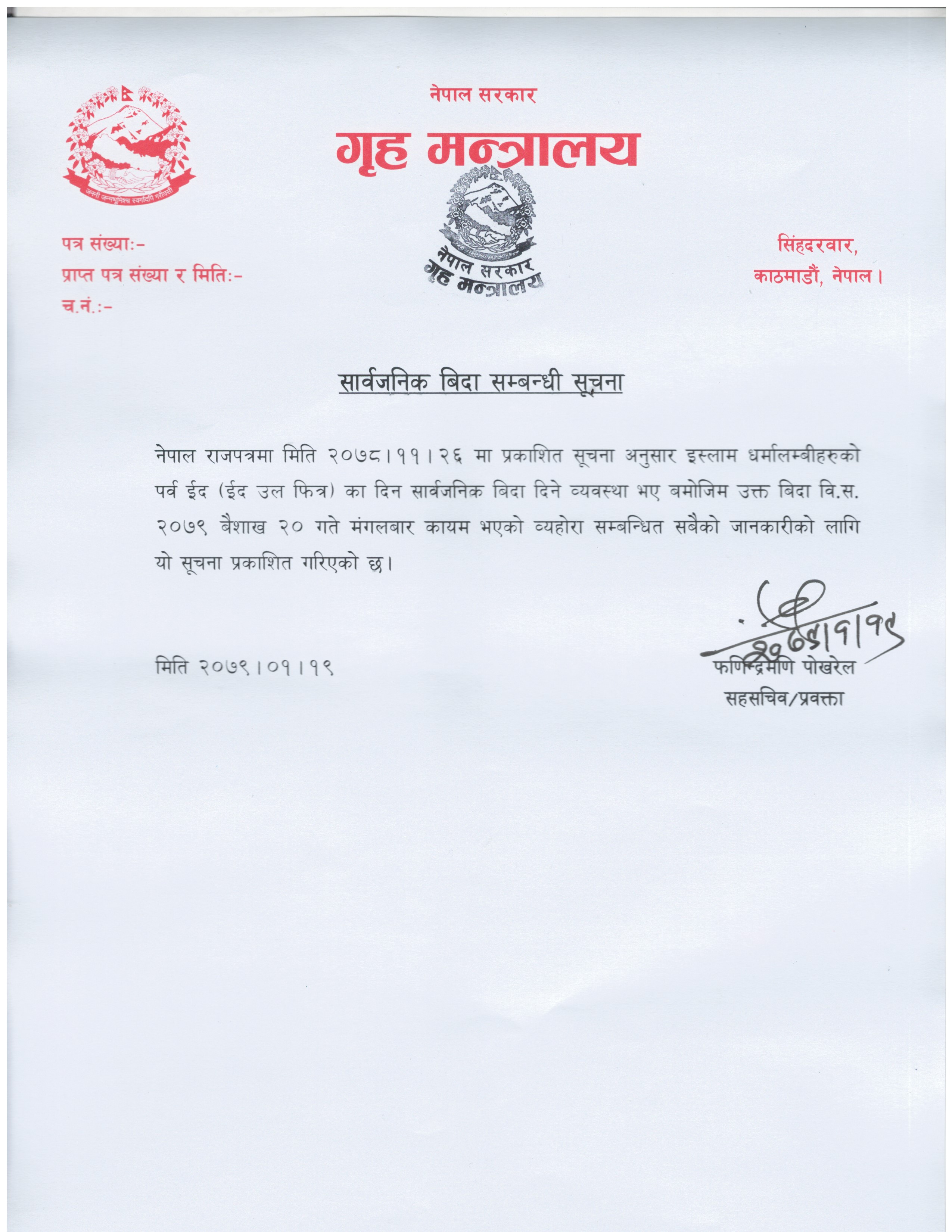 सार्वजनिक विदाको दिनमा सेवा प्रवाह हुने सम्बन्धी सूचना ।