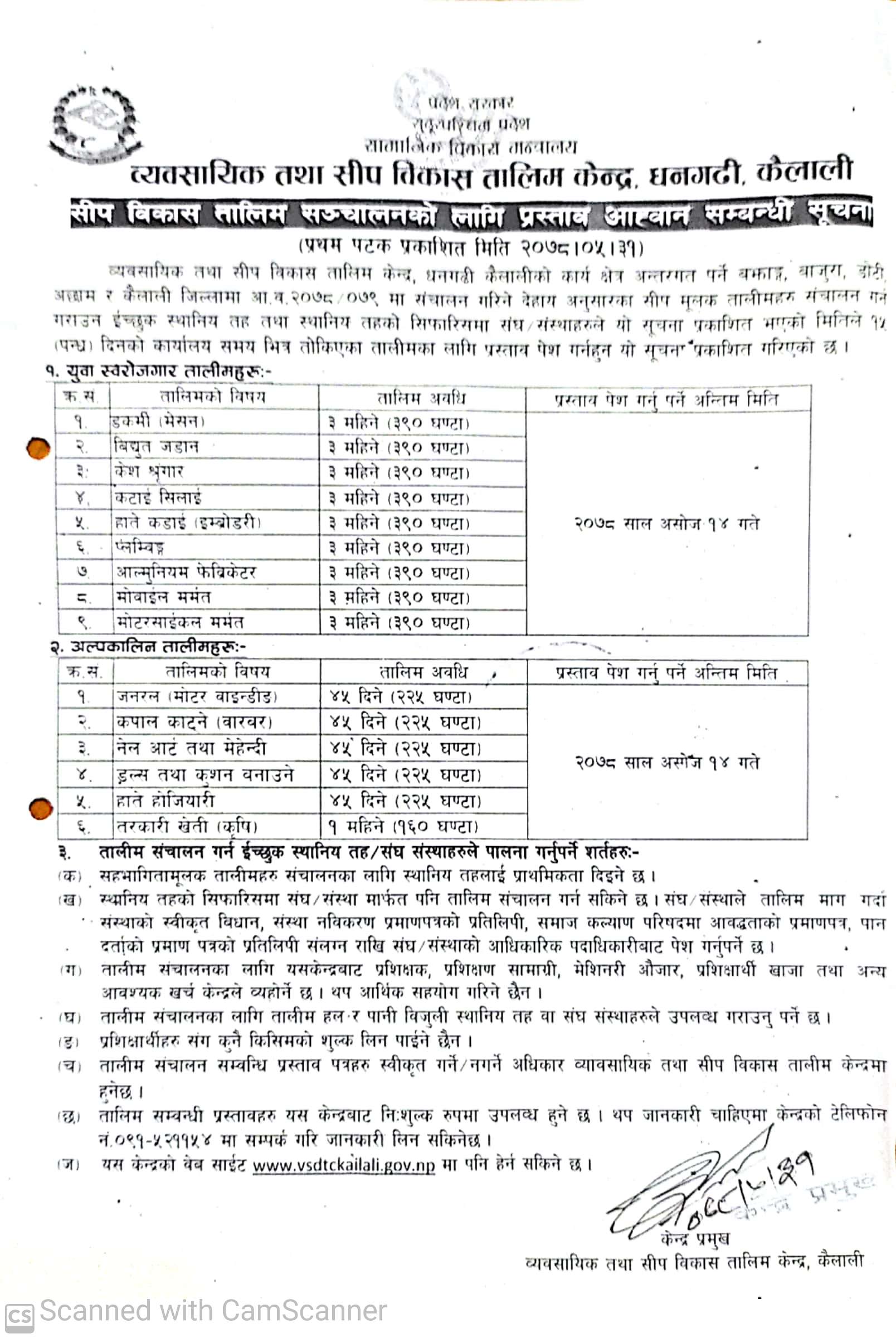 व्यावसायिक तथा सीप विकास तालिम केन्द्र धनगढीको प्रस्ताव आह्वान सम्बन्धी सूचना ।